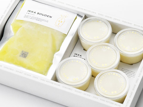 「メロンフロートを本物のメロンで作ったらさぞ美味しかろう」と思い、作り上げたのがこのマスクメロンの生絞りピューレと高知のアイスクリームの詰合せです。